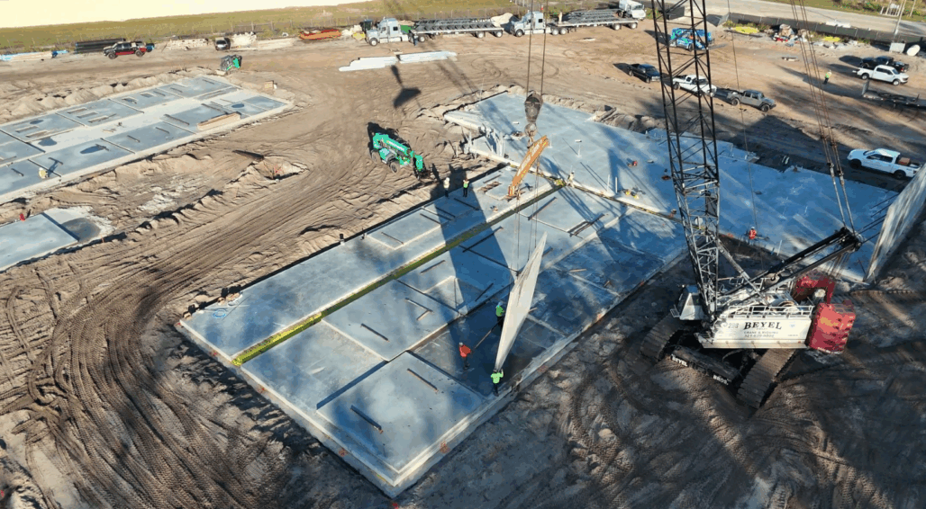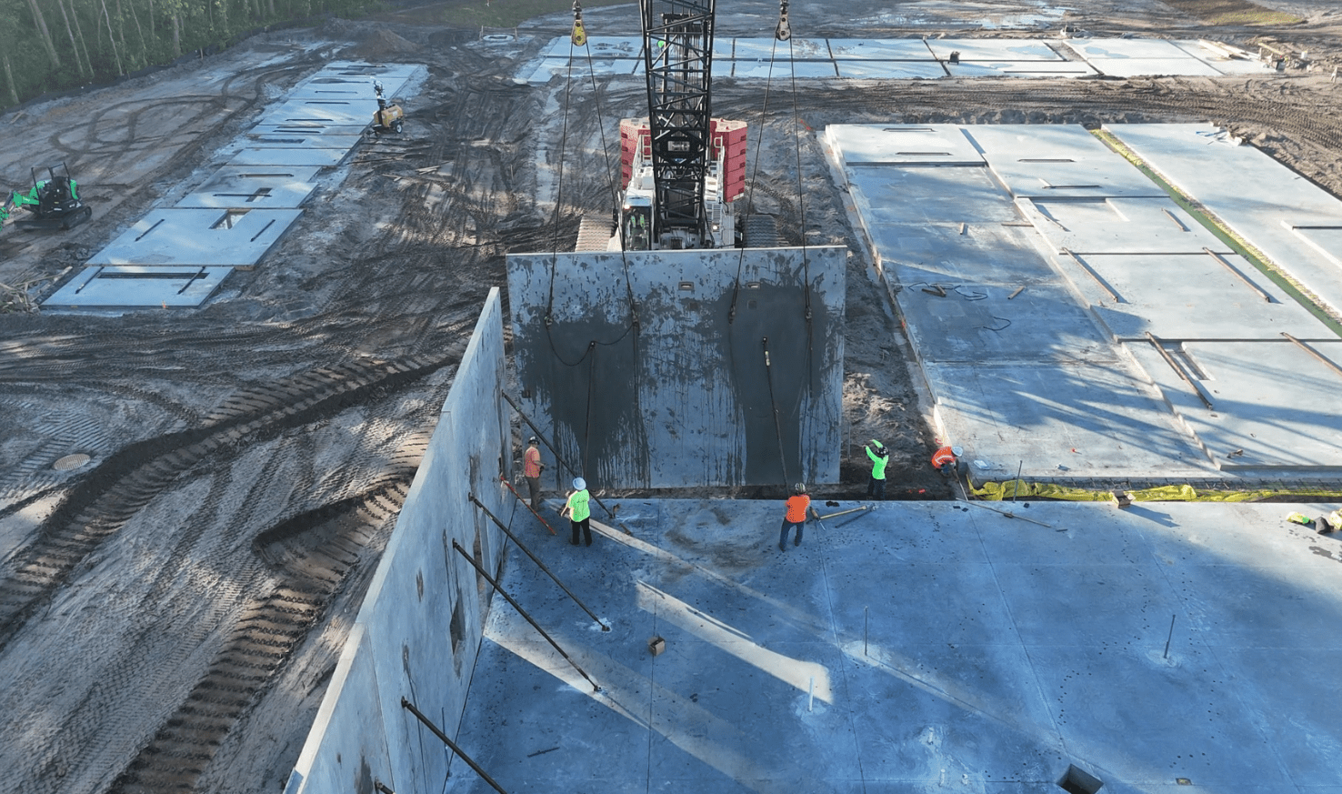 Rigging, crane procurement, and staging to lift and tilt panels into position. Installation of bracing systems to plumb and secure panels during construction. Permanent panel-to-foundation and panel-to-panel connections, welding, grouting, and sealing.
